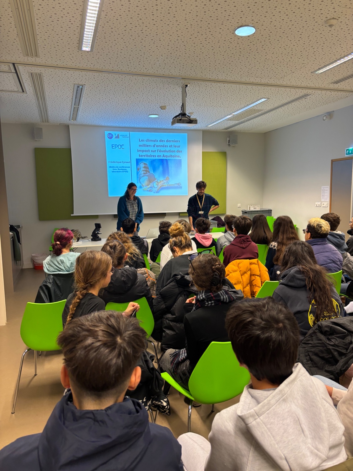 Dans le cadre du Projet « Océan », le vendredi 21 novembre au Muséum de Bordeaux, les élèves de 3C ont rencontré Frédérique Eynaud, chercheuse spécialisée dans l’évolution du climat depuis 3 000 ans et de son impact sur le littoral. Elle a notamment expliqué à nos élèves comment les scientifiques reconstituent les climats passés et étudient l’érosion des côtes, la montée du niveau de la mer ou encore les changements des paysages littoraux. Les élèves ont pu poser leurs questions et mieux comprendre les enjeux actuels du réchauffement climatique. Une rencontre enrichissante qui s’inscrit pleinement dans leur projet de découverte du milieu marin.