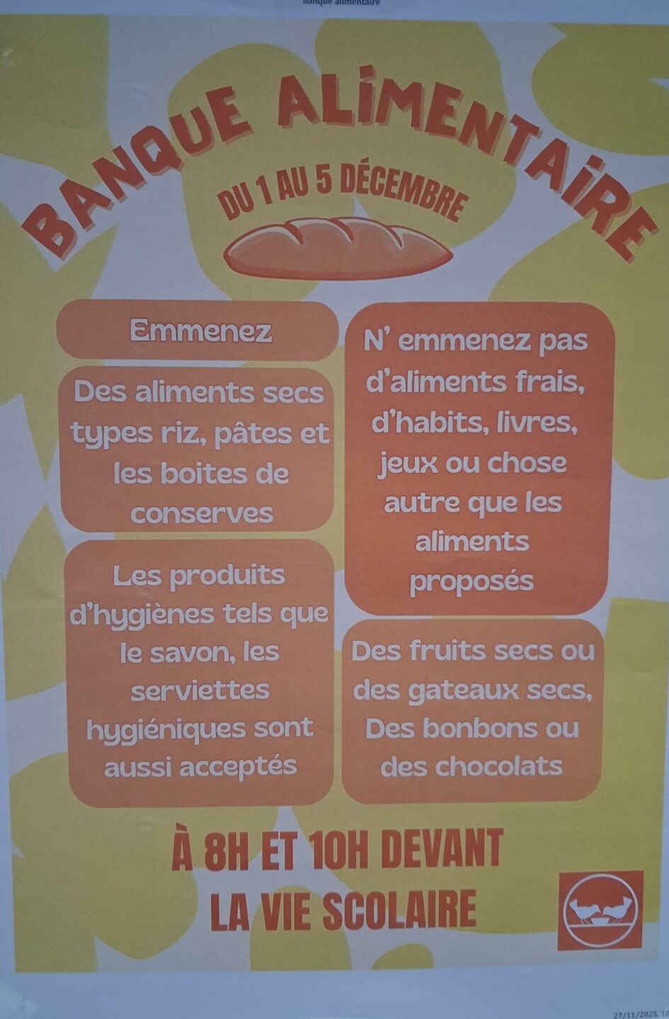 Les élèves de 3E organisent une collecte alimentaire au profit de la Banque Alimentaire. Du 1 au 5 décembre, vos enfants pourront donner des aliments à leur entrée au collège à 8h et à la récréation de 10h. Des élèves les accueilleront devant le bureau de la vie scolaire pour récupérer les dons. Seuls des aliments secs et conservables seront acceptés. Pas d’aliments périssables comme les fruits et les légumes. Les informations concernant les produits acceptés se situent sur l’affiche ci-dessus. Des passages dans les classes et des affiches ont été réalisés. Tous les élèves ont donc été informés.
