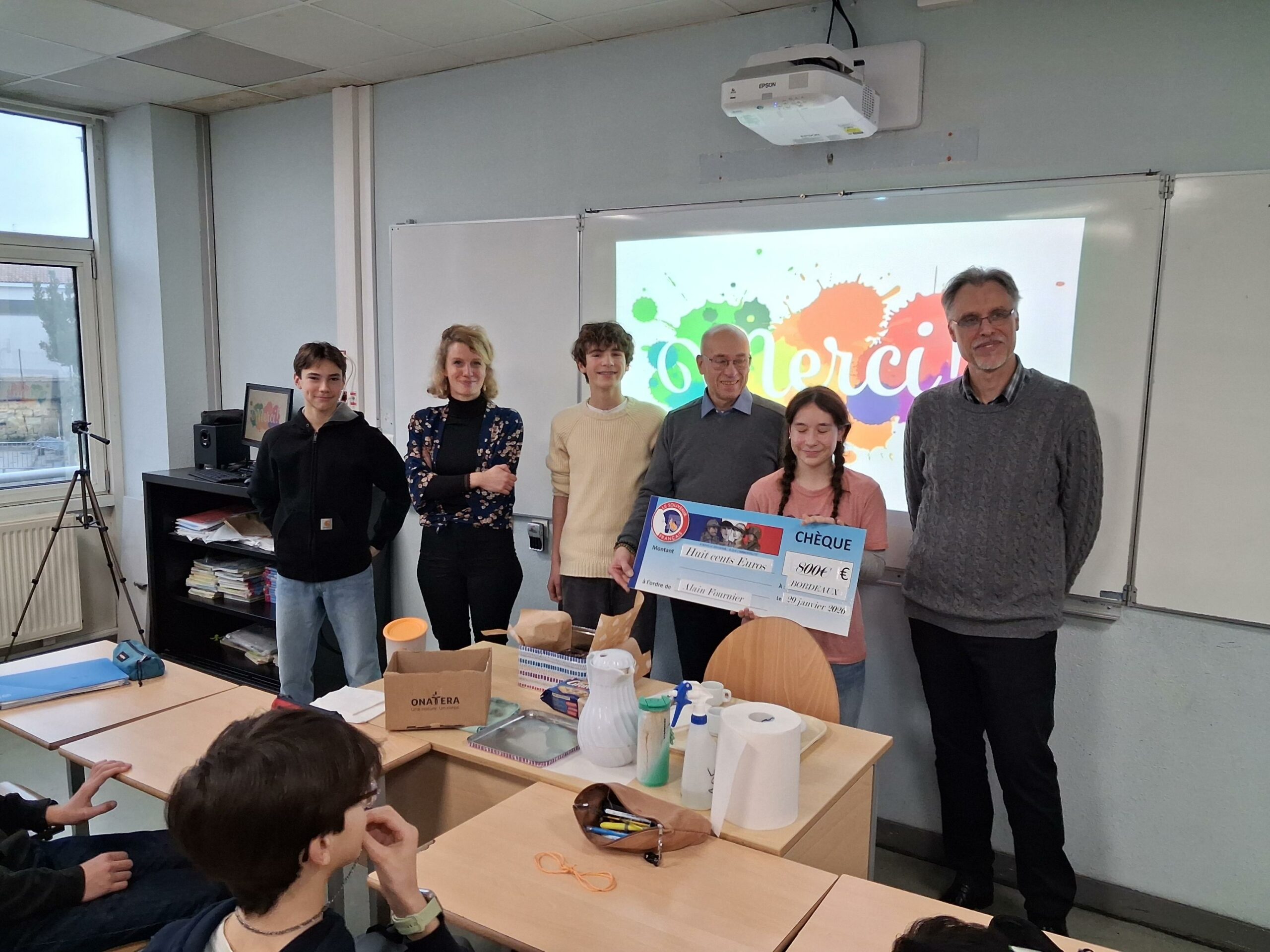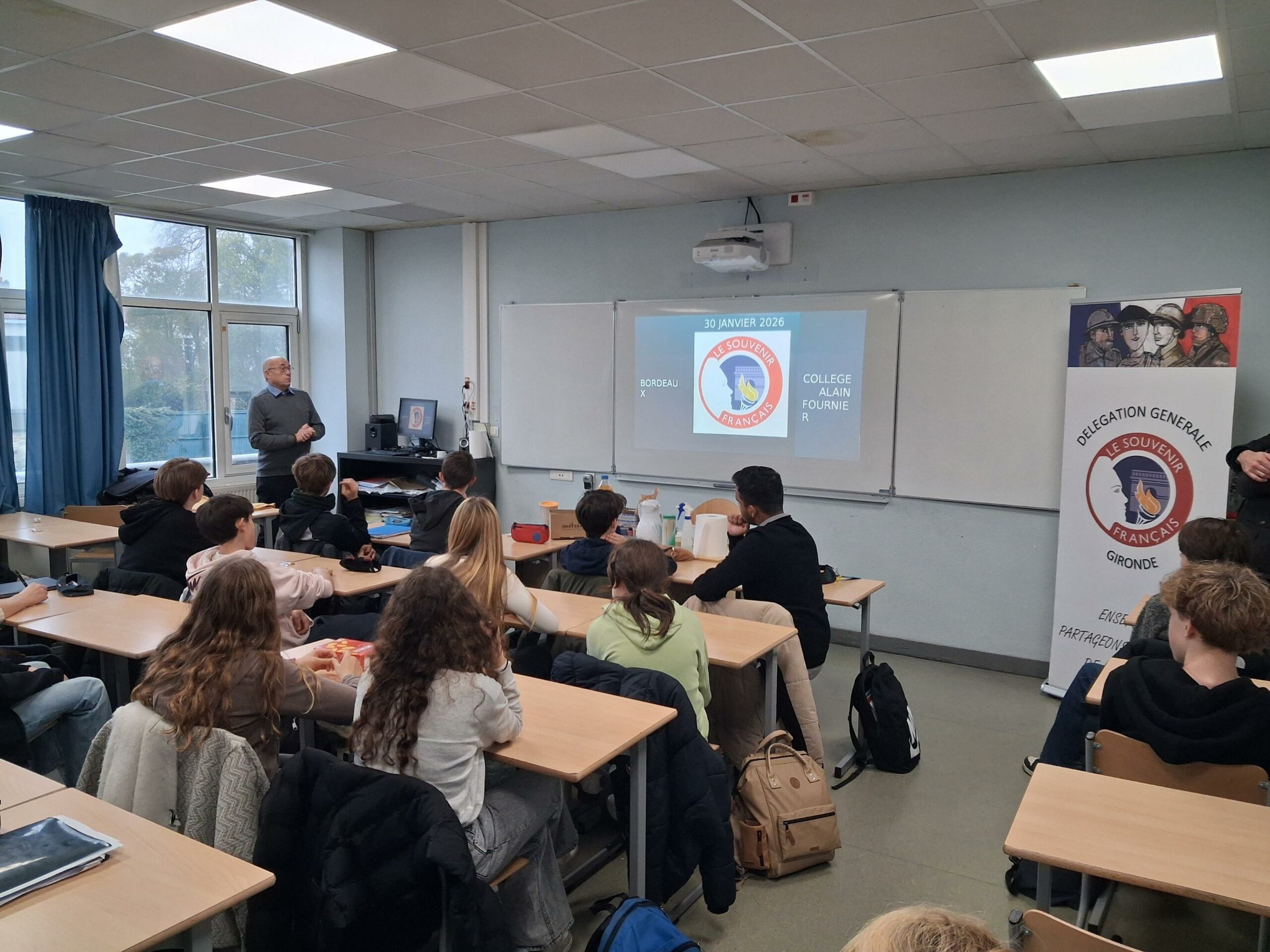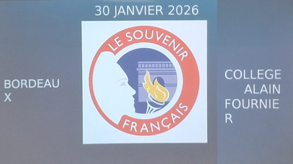 À l’invitation de Monsieur Brochon, le principal du collège, Monsieur Perrichon, le délégué pour la Gironde du Souvenir Français, est intervenu, le jeudi 30 janvier, auprès des élèves de 3E pour leur présenter son association. Cette dernière, apolitique et areligieuse, a comme objectif de perpétuer le souvenir des personnes mortes pour la France en entretenant le devoir de mémoire auprès des jeunes, en participant aux cérémonies officielles ainsi qu’à l’entretien des stèles commémoratives. À la fin de la séance de présentation, Monsieur Perrichon a remis un chèque de 800€ correspondant au don effectué par son association au collège pour aider à l’organisation du voyage en Normandie que la classe effectuera à l’initiative de Madame Leromain, la professeure « d’history » de la section internationale américaine. Ce séjour normand s’inscrira dans l’étude du débarquement des troupes alliées, sur le sol français en juin 1944, à travers la visite de lieux emblématiques. Un grand merci au Souvenir Français !