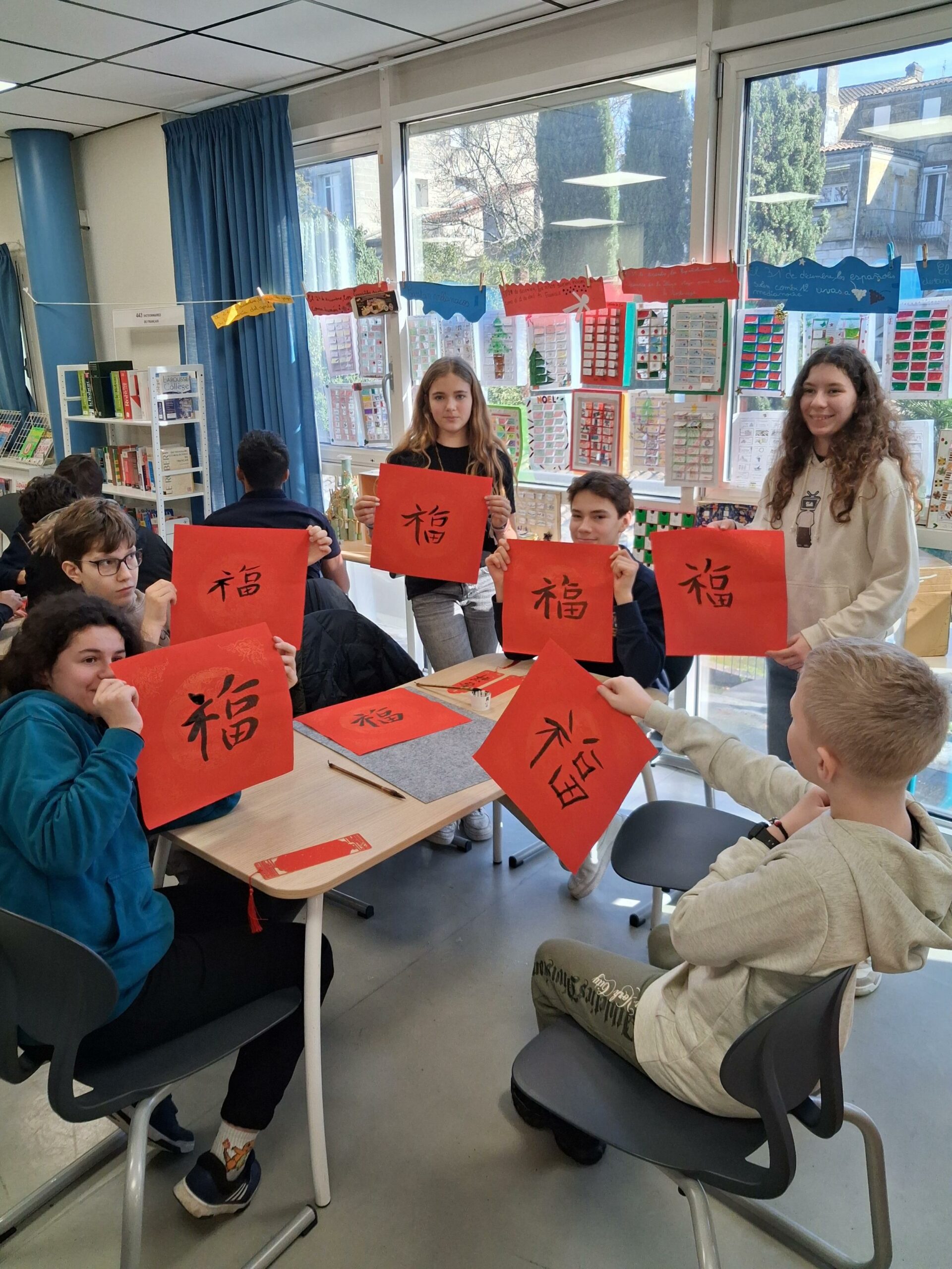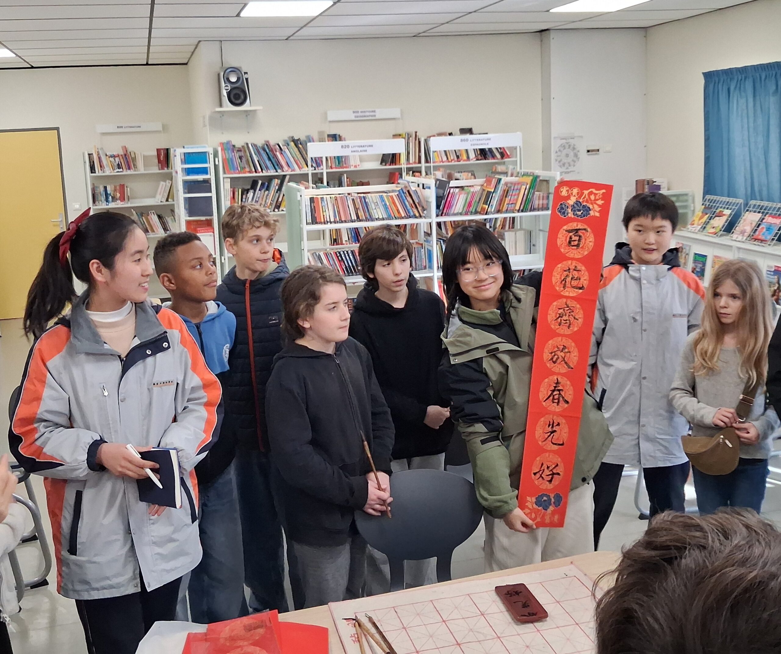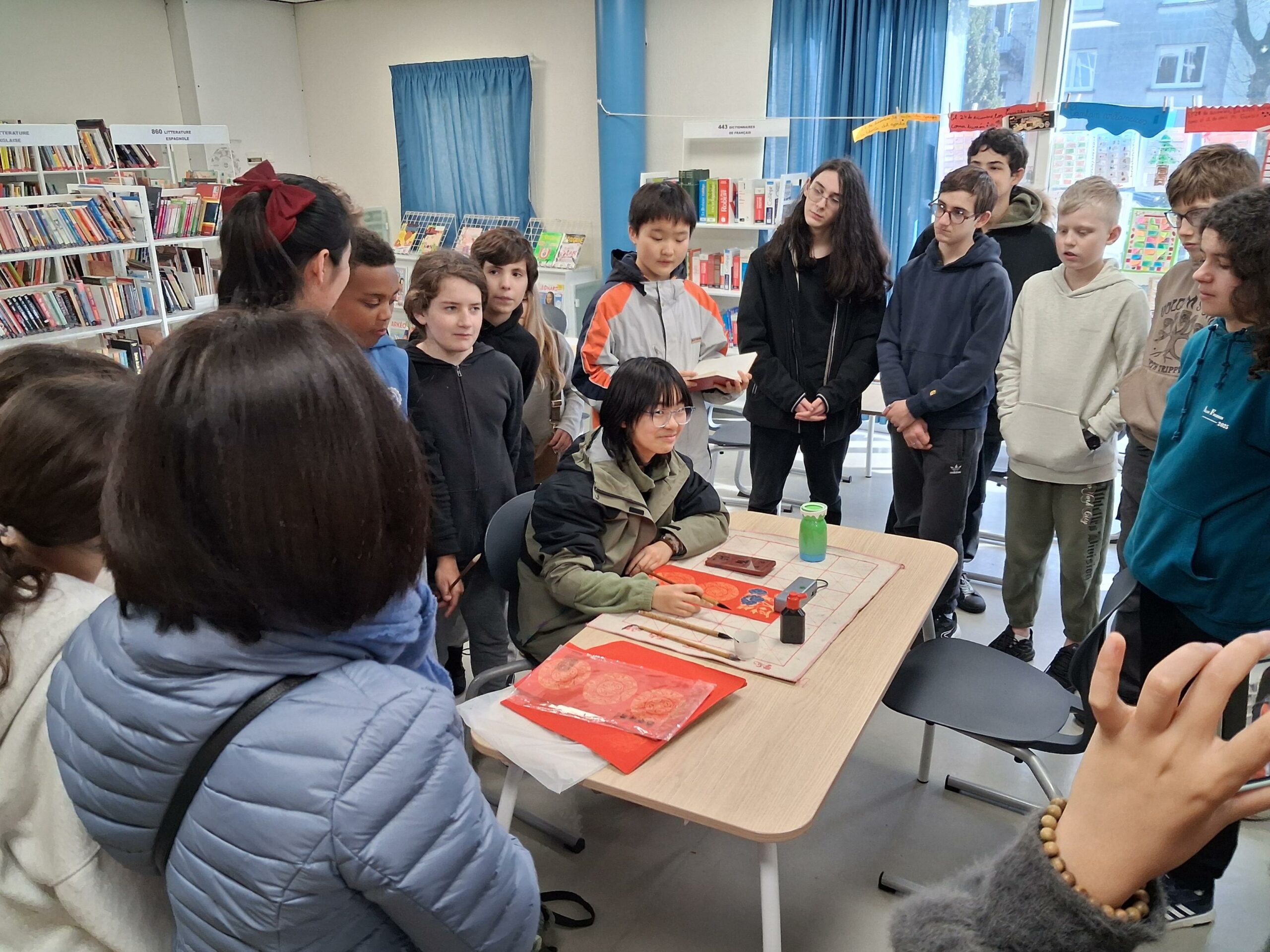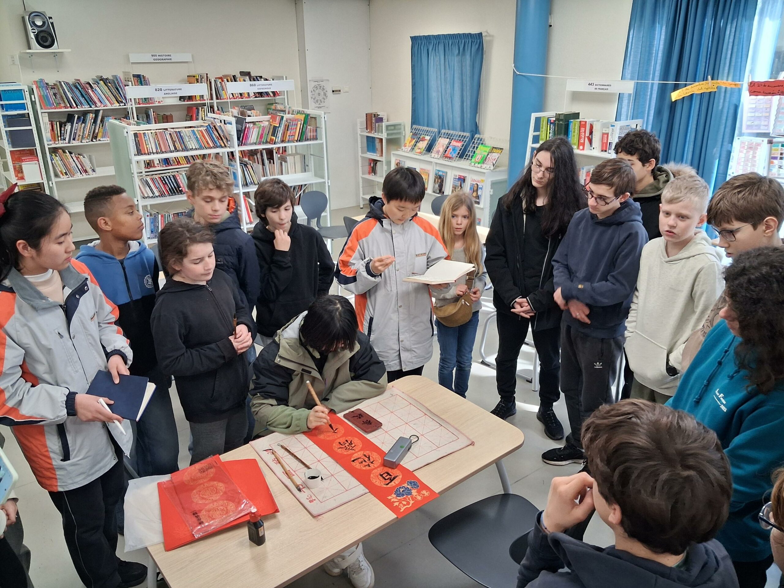 Notre établissement accueille en ce moment un groupe d’élèves chinois et leurs professeures. Les élèves sinisants de Mme Audouin ont donc un(e) correspondant(e) avec un riche programme d’activités qui jalonnera cette semaine. Ce mardi midi, au CDI, une élève chinoise spécialiste de la calligraphie a effectué une démonstration de son art devant des élèves du collège. Ces derniers ont ensuite été invités à dessiner, à l’aide d’un pinceau et d’encre de Chine (!), des caractères qui correspondent aux différents symboles des années. 2026 est celle du cheval en Chine. Une rencontre interculturelle réussie !
