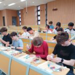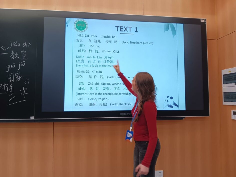 « Aujourd’hui jeudi 2 avril, nous sommes allés au campus du lycée de l’École de Langues Étrangères de Nanjing. Nous l’avons visité dans la matinée avec son architecture moderne et son style épuré. Les bâtiments et équipements sont vraiment impressionnants. Il y a même un café librairie ! Nous avons suivi un cours de danse du dragon et fait des chorégraphies. Et puis l’après-midi, nous avons assisté à un cours de chinois puis un cours de patchwork de tissus. Le midi nous avons très bien mangé à la cantine. Le soir, les parents sont venus nous chercher au campus. »