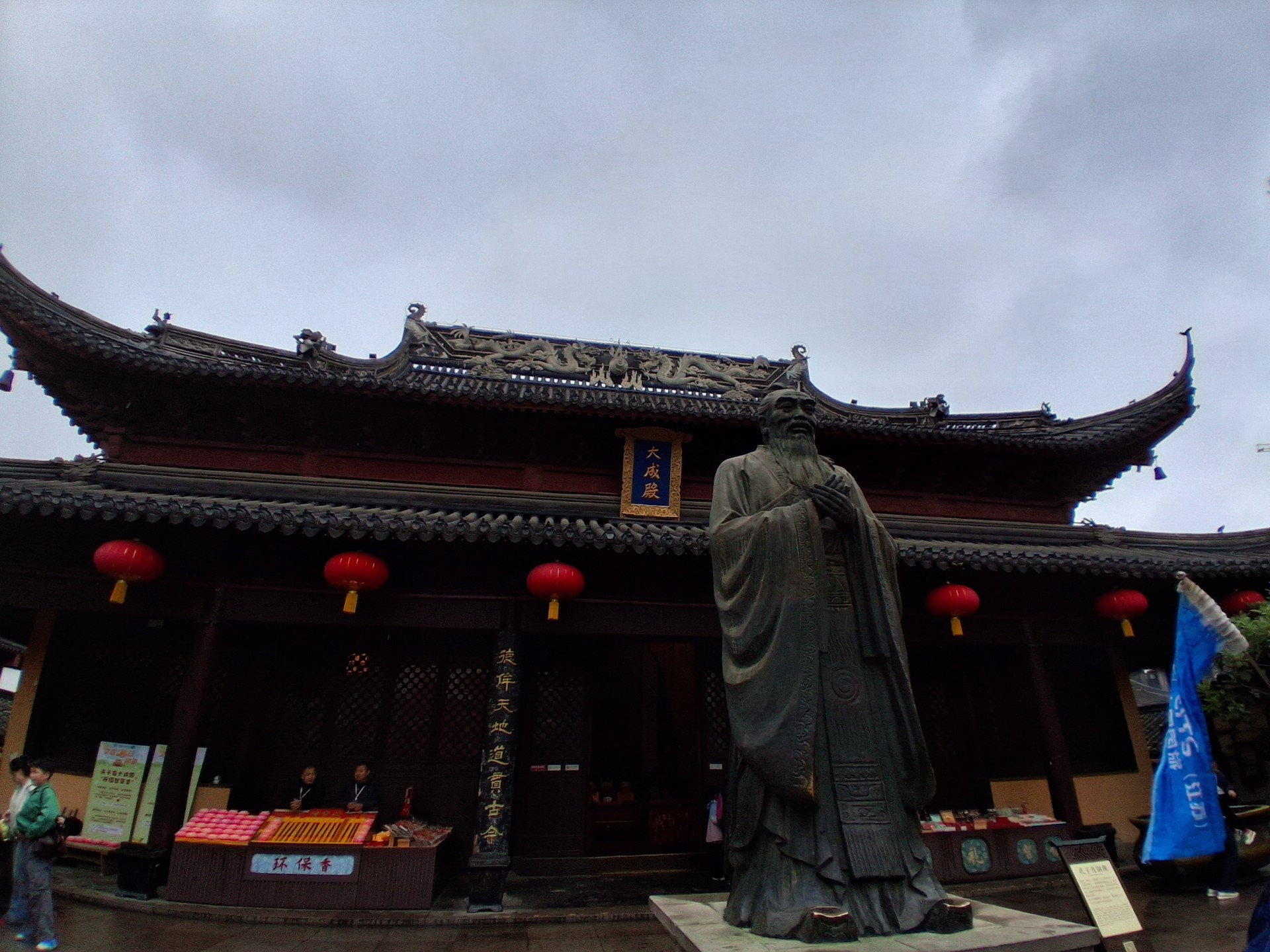 » Aujourd’hui nous avons visité le temple du culte du Ciel et le temple de Confucius puis la vieille ville de Nankin le long de la rivière. A l’entrée du premier temple il y a des lions et lionnes qui gardent le temple. On les différencie grâce aux différents détails, la lionne a un lionceau ce qui symbolise la chance et le lion a une boule à ses pieds ce qui symbolise la prospérité du monde. Dans le sanctuaire il y a une statue de Confucius de 4,20m en bronze. La vieille ville est un endroit très animé qui regroupe beaucoup de boutiques et le lieu où se passaient les épreuves des examens pour devenir, si on réussissait, mandarin c’est-à-dire conseiller de l’empereur. Nous avons eu un temps libre et fait de nombreux petits achats tout le long de la journée. »